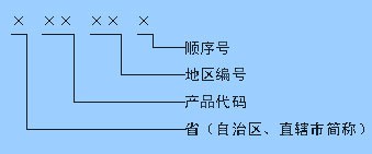四、生產(chǎn)登記批準(zhǔn)書采用全國可識別的編號方法,由省(自治區(qū)、直轄市)簡稱、產(chǎn)品代號、地區(qū)編號、順序號組成,如下圖所示: