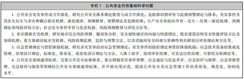 公共安全领域的科技问题涉及多种基础学科的交叉,包含众多复杂科学问题,必须加强公共安全领域的前瞻性、基础性和原创性科学研究,促进不同学科间的开拓、交叉、渗透与结合,为解决公共安全中的关键技术提供新思路、新方法,为公共安全关键技术的攻关与应用提供理论基础,为我国公共安全科技水平持续提升提供重要理论支撑。